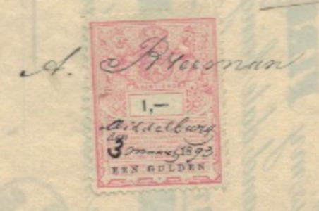 2 stempels van de Credietvereeniging, agentschap Rotterdam en de afdeling Middelburg, met Ned. Indische belsting plakzegel van 5 cent op de voorkant en op de achtezijde een NL belastingzegel van 1 gulden, met daarop geschreven:" Middelburg maart 1893".