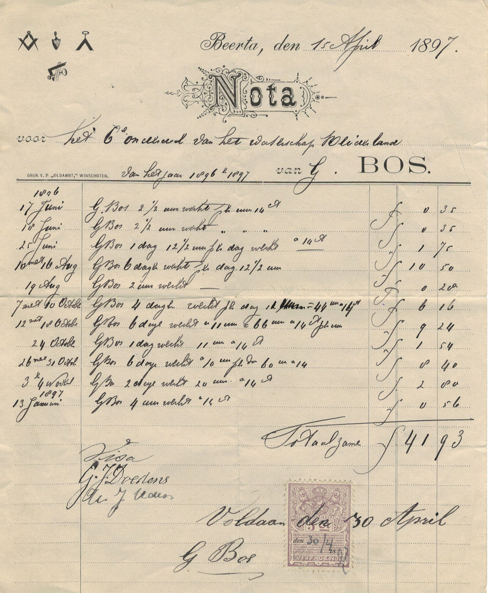 Beerta, 15 april 1897, gezegelde nota voor gewerkte uren aan het 6e onderdeel van het Waterschap Reiderland; afm. 17 x 21 cm., Jugendstilversieringen rond het woord "Nota" en heel kleine afbeeldingen van timmermansgereedschappen, conditie: 2 nette vouwen en div. minieme gebruikssporen, prijs € 25.