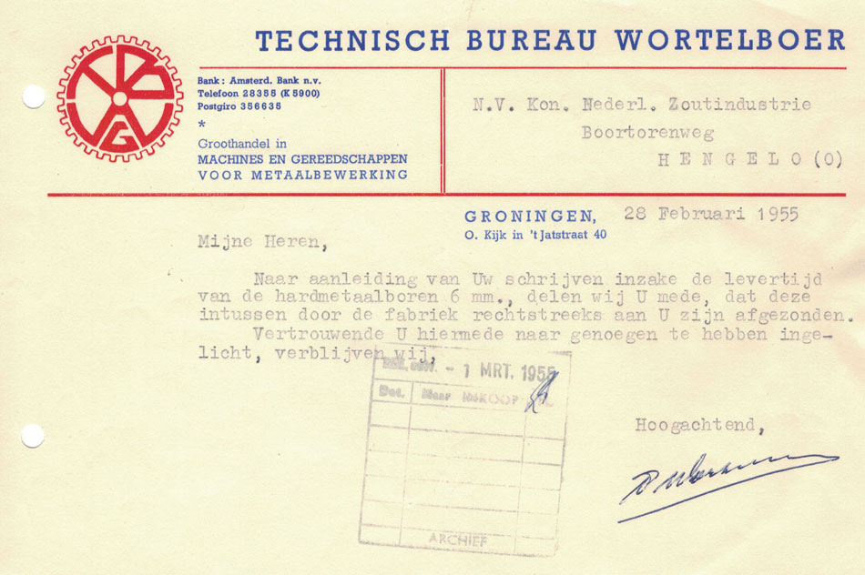 Rekeningen uit 1955 met rood logo en in blauwe druk, alle met 2 archiefgaten.