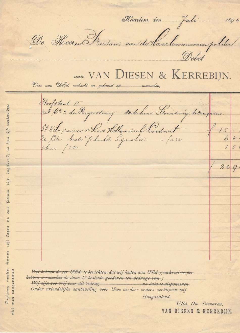 Rekeningen met - als hofleverancier - het Nederlandse wapen van H.M. de Koningin-Weduwe (Emma) met haar Latijnse lijfspreuk: " Palma sub pondere crescit", vertaald: "De palmboom groeit tegen de verdrukking in."; Afm.