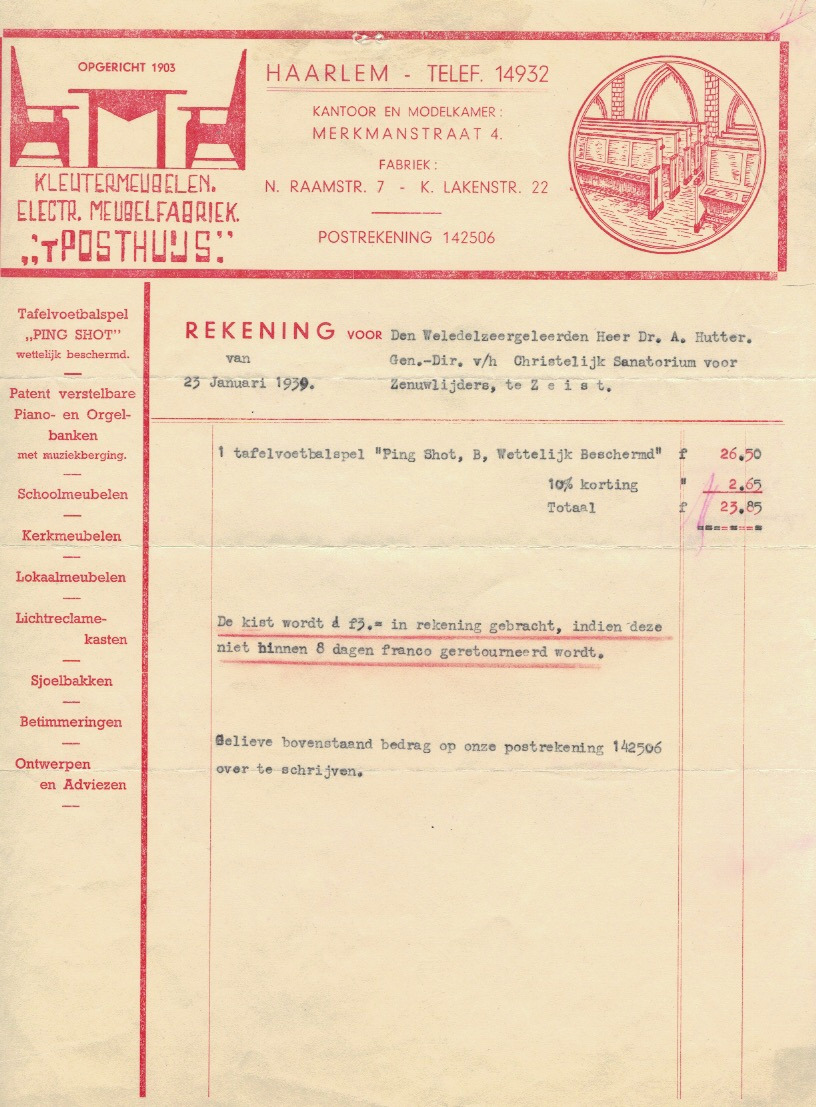 Rekening in rode druk aan het Christelijk Sanatorium voor Zenuwlijders te Zeist.