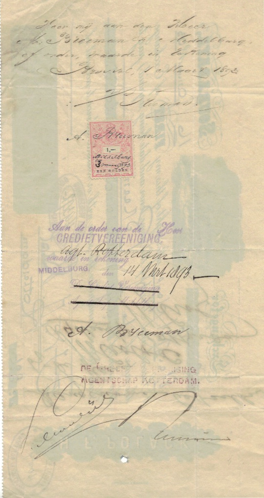 2 stempels van de Credietvereeniging, agentschap Rotterdam en de afdeling Middelburg, met Ned. Indische belsting plakzegel van 5 cent op de voorkant en op de achtezijde een NL belastingzegel van 1 gulden, met daarop geschreven:" Middelburg maart 1893".
