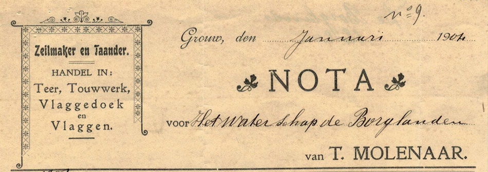 Rekening uit 1904 (afm. 17 x 12 cm) voor het Waterschap Borglanden (achterop staat: "voor de Borglands Molen") voor in 1903 herstelde zeilen, met fraaie Jugendstil versieringen in het briefhoofd. Conditie 2 lichte vouwen en enkele heel lichte nietjes-sporen, heel mooi ! Prijs € 20.