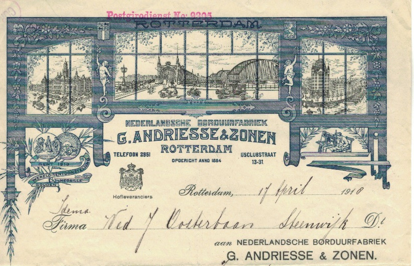 Nota met prachtig briefhoofd, met gravures in blauwe druk van diverse Rotterdamse stadsgezichten.