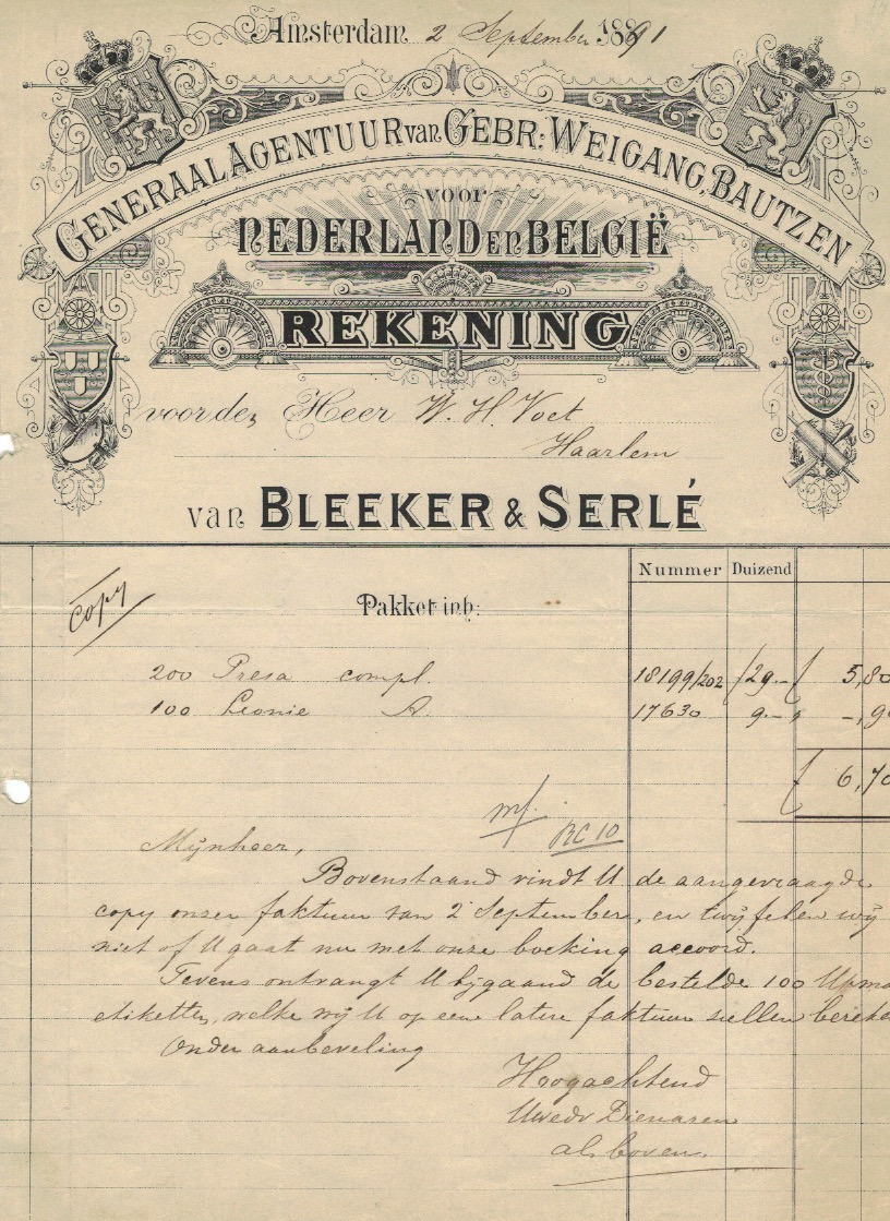 Viëtor & Co. Rekening uit 1914, afm. ca. 20,5 x 27 cm., Verkocht / niet meer te koop. met een gravure (5 x 3 cm.) van het Hofleveranciersbord (Koninkrijkswapen), toegestaan in 1899, en van het wapen van de Groninger studentenvereniging Vindicat atque Polit (Latijn voor Handhaaft en Beschaaft), toegestaan in 1898, met 2 symbolen: zwaard (handhaven) en vijl (beschaven). Zie hier de geschiedenis van deze vereniging. Verkocht / niet meer te koop.