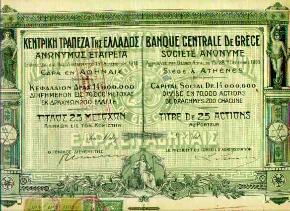 Established in 1893; latest change of statutes: 6-6-1919. Titre d'une action de 100 Drachmes (certificate of one share of 100 Drachmes), brown on light green field on beige; beautifully decorated piece, size 23 by 30 cm, with illustrations of god Hermes (Eng: Mercury) and 3 goddesses. Standing is Athena, the goddess of the city of Athens, dressed in armour and wearing a helmet. At her feet a woman with on her lap a scale model of the world famous Parthenon, the temple on the Acropolis complex, dedicated to Athena. The Acropolis is also depicted. At the left a semi nude goddess holds a blindfold. In the top border is a small vignette of Athena in armour, holding a spear. Athena's owl, symbol of wisdom, is also depicted. Also depicted is an olive branch, symbol for the olive tree, Athena's gift to the city, that named itself after her in gratitude for that. Design by Henri Brauer; printed at Imprimerie Richard, Paris. A beauty to frame !