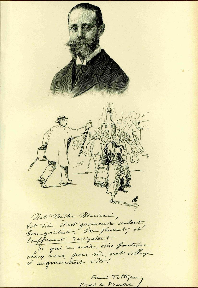 English: In 1863, a Corsican pharmacist and chemist Angelo Mariani, creates and markets in Paris a fortifying drink based on wine from Bordeaux to which Coca leaves were added, called Vin Mariani. From 1868, the wine Mariani becomes a real success. It is considered a drug and recommended by doctors. Angelo Mariani had a good business sense. He had the good idea to have Mariani wine advertised by personalities of his time. An album of 14 volumes has been published containing celebrities flattering remarks about the wine Mariani and its derivatives (elixir, infusion, paste tonic and chest, ...). Here the text of Francis Tattegrain.