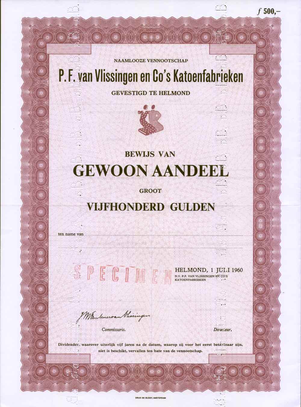Gev. te Helmond (N.Br) aan de Binnen Parallelweg 27; In 1846 opgericht door Pieter Fentener van Vlissingen en zijn compagnon Jan Matthijsen. Vanaf 1917 is het een beursgenoteerde N.V. Vanaf 1970 werd de bekende naam Vlisco gehanteerd (ontleend aan Vlissingen & Co). In 1972 werd het bedrijf een onderdeel van Gamma Holding, de naam Vlisco bleef in gebruik. In 2010 heeft Gamma Holding de Vlisco Groep uit geldnood verkocht aan Actis , een Engelse private equity firma. Het bedrijf produceerde o.a. de bekende rood-bonte boeren-zakdoek, maar werd beroemd om zijn op Batik gebaseerde bedrukte stoffen, eerst voor de Nederlands-Indische markt en later, tot heden, voor de Afrikaanse markt. Lees de uitgebreide en boeiende geschiedenis van dit beroemde bedrijf dat Helmond op modegebied opstuwde tot "het Parijs voor Afrika". Div. oude aandelen van dit bedrijf zijn hier te koop.
