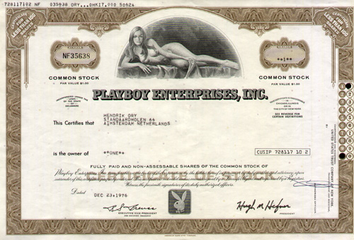 Beautifully engraved certificate, printed by the American Banknote Company with a vignette of the nude Miss February 1971, Willy Rey and the Playboy bunny logo. This item has the printed signature of the Company’s Chairman of the Board, Hugh Hefner. This certificate for 1 share was issued in 1976 to Hendrik Ory, Standaardmolen64 in Amsterdam. Condition EF, unfolded, price € 300. Order now !