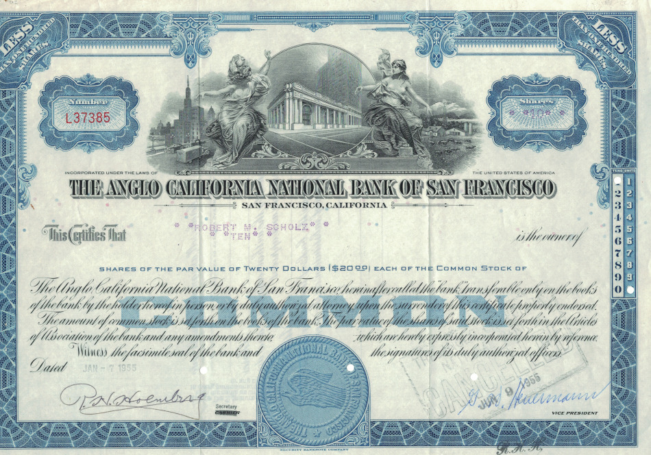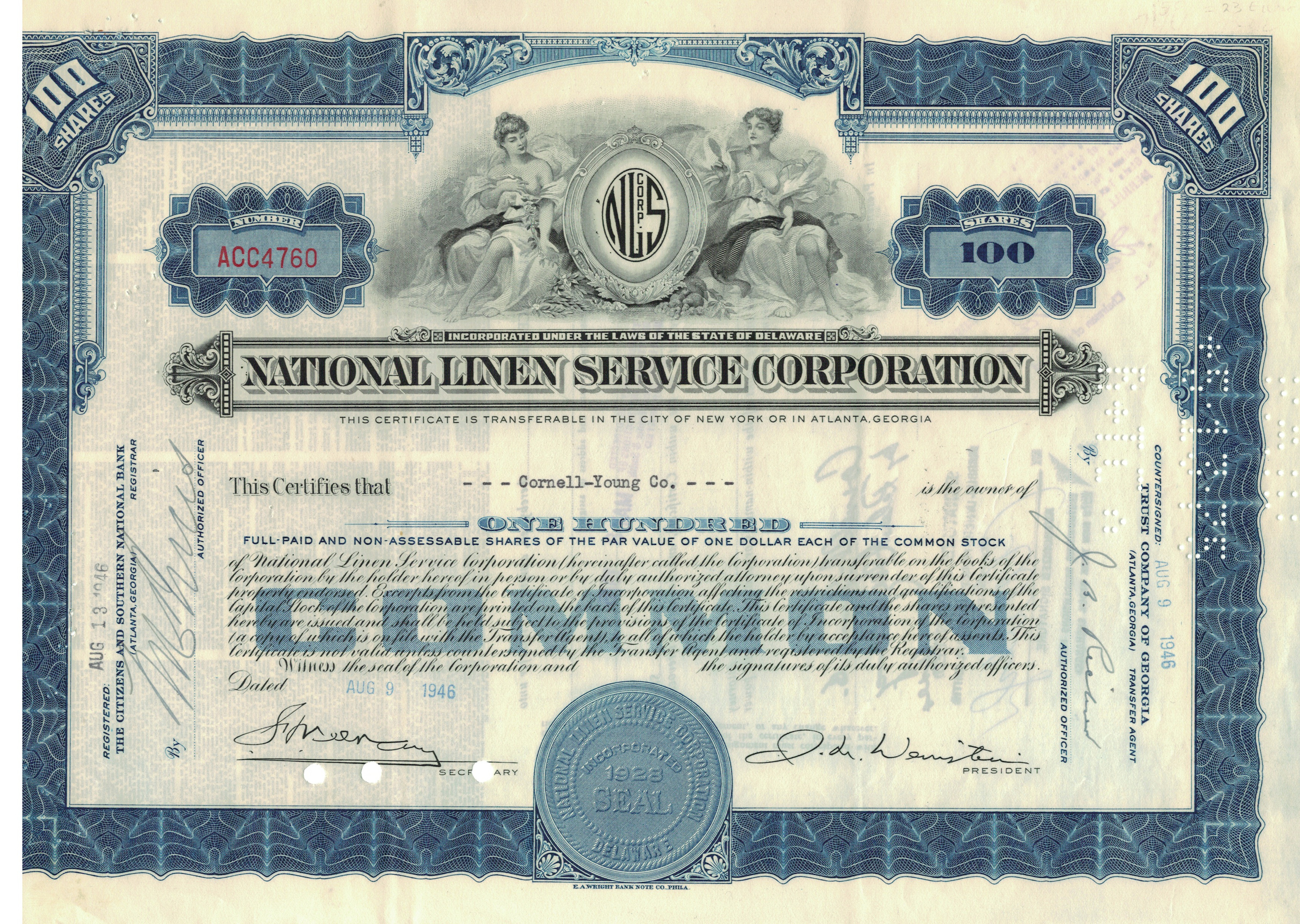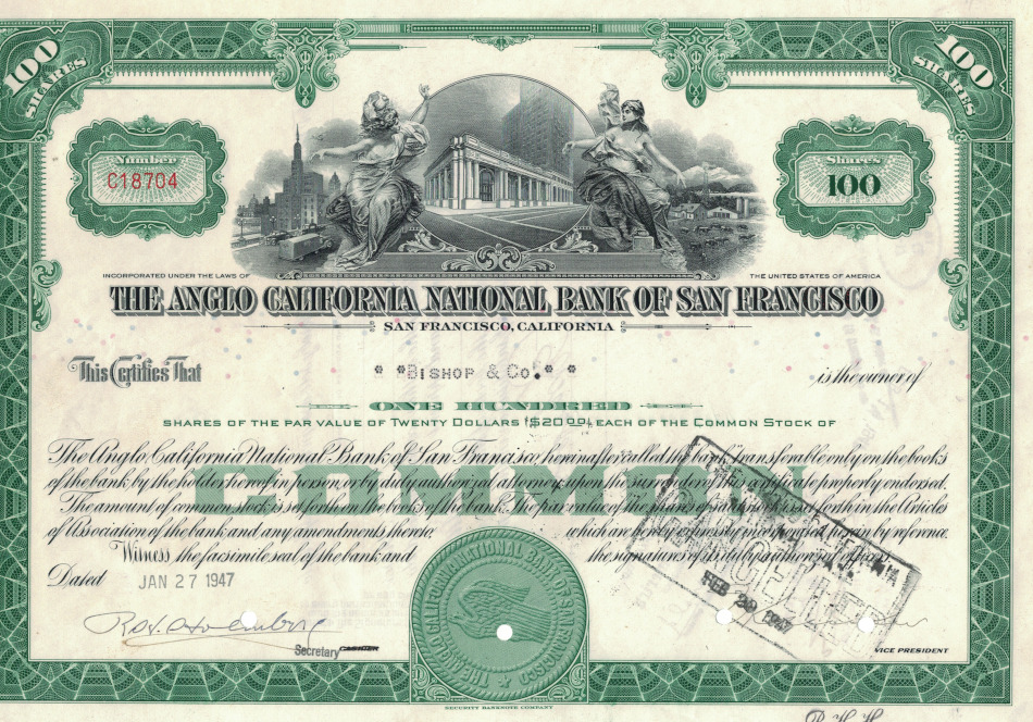 ---------- 1930, 100 shares, blue border, unfolded, hole punched characters, price 50 Euro.