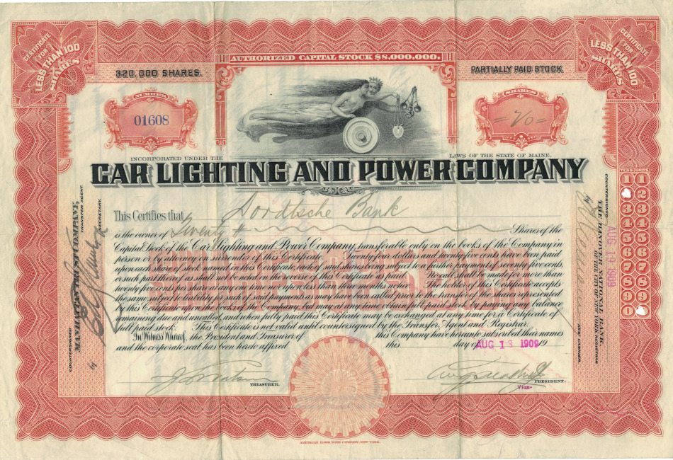 Certificate of < 100 shares, no. 01608, orange border, vignette: man and woman (one breast uncovered), holding a lamp and electron ball equipment, flying horizontally together, Capital only 320.000 shares, written out in the name of the Dordtsche Bank, The Netherlands, 75 Euro.