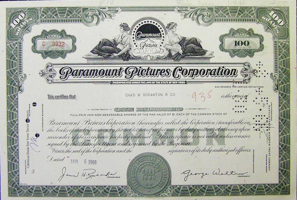 New York (incorporated in 1944), 1971, 100 shares, green border, hole
